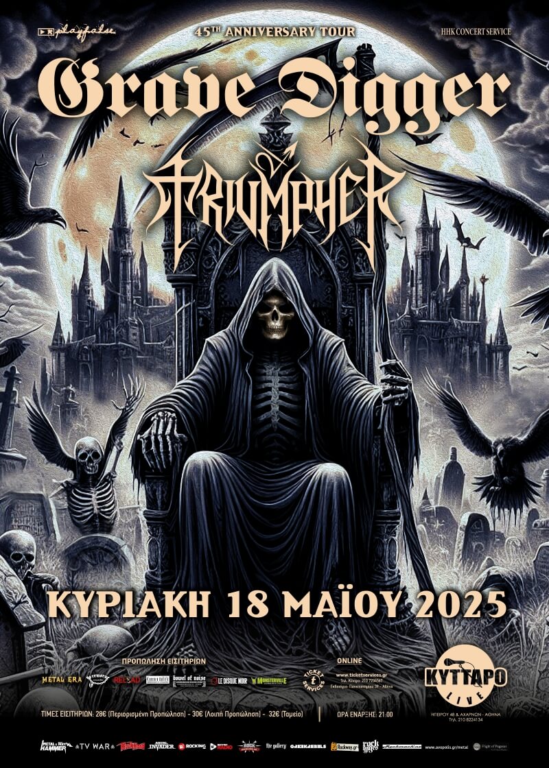Οι θρυλικοί Γερμανοί heavy / power metallers GRAVE DIGGER επιστρέφουν στη χώρα μας για μία εκρηκτική συναυλία τον Μάιο του 2025 που υπόσχεται να μείνει χαραγμένη στη μνήμη όσων την παρακολουθήσουν. Μαζί τους, οι ανερχόμενοι Έλληνες epic metallers TRIUMPHER, που θα προετοιμάσουν το έδαφος με τις δυναμικές τους συνθέσεις.