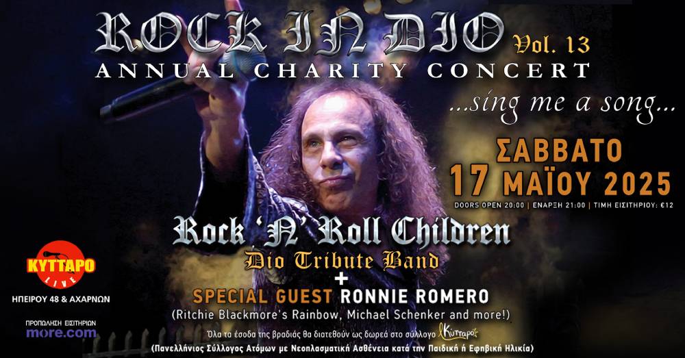 Το Σάββατο 17 Μαϊου 2025 το ROCK IN DIO Vol.13 παίρνει θέση για ακόμα ένα Annual Charity Concert με τους Rock ΄n΄ Roll Children The Greek DIO tribute band LIVE με SPECIAL GUEST τον RONNIE ROMERO (Richie Blackmore’s RAINBOW, Michael Schenker and more).