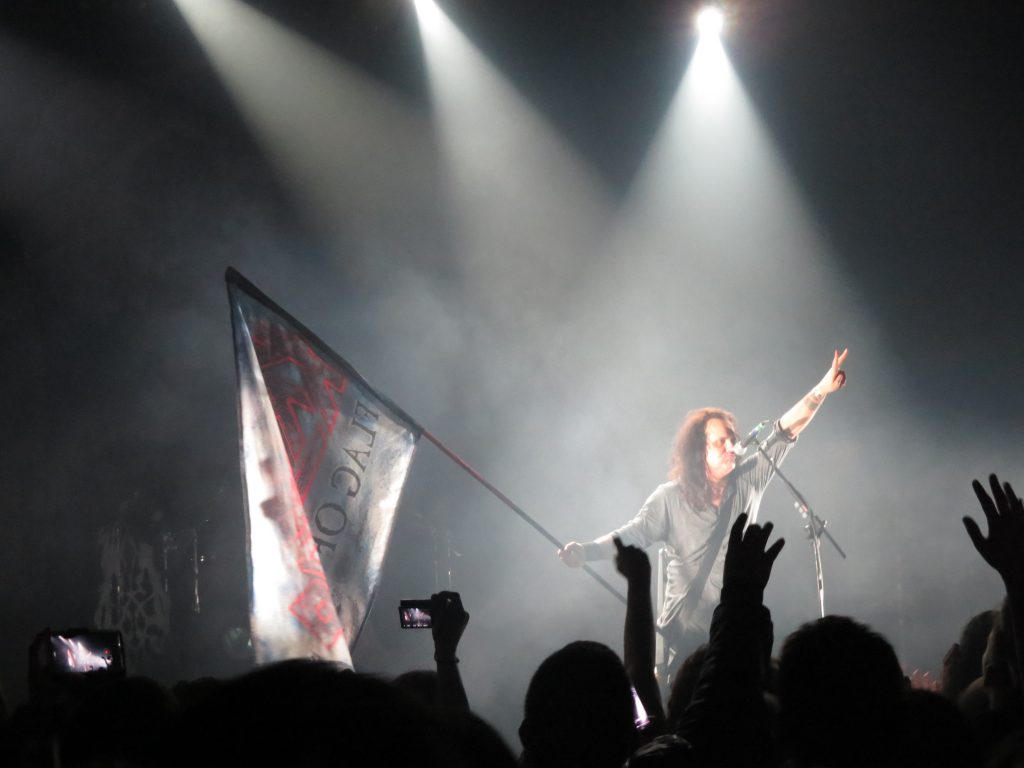 “People Of The Lie” στη συνέχεια, πριν εμφανίσει στη σκηνή ο Mille την σημαία με το λογότυπο “Flag Of Hate” , σηματοδοτώντας την εκτέλεση του ομώνυμου τραγουδιού, αφού πρώτα όμως ζητήσει – λάθος, απαιτήσει – τις κραυγές του κόσμου που βρισκόταν στον πάνω όροφο και πίσω… ιαχές από τους πίσω, ιαχές από τους μπροστά και αφού έμεινε ικανοποιημένος από τη συμμετοχή, μπαίνουμε στο τραγούδι, για να ακολουθήσει ένα από τα ποιο συναυλιακά κομμάτια τους…“Phobia” λοιπόν, με φώτα, καπνούς, τον κόσμο να κραυγάζει και να ακολουθεί τον Petrozza. Μια μικρή παρένθεση εδώ, για να αναφέρω ότι αν κάποιος ήθελε να κάνει ένα διάλειμμα από την ένταση, μπορούσε απλά να κοιτάει τον Sami-Yli (ο έτερος κιθαρίστας), ο οποίος είχε μια ήρεμη έκφραση στο πρόσωπο και ένα χαμόγελο, λες και έβγαινε βόλτα… φαντάζομαι στους Kreator έτσι αρέσει η Ελλάδα, όποτε έρχονται για συναυλίες, μια βόλτα να δούνε καλούς φίλους, πιστούς οπαδούς και να περάσουνε πολύ ωραία μαζί! Κλείνει η παρένθεση και συνεχίζουμε με πρόσφατα κομμάτια, αλλά και το “Total Death” από το μακρινό 1985. Ανοίγει δεύτερη παρένθεση εδώ… φαντάζομαι και πάλι ότι μερικοί old-school οπαδοί τους θα ρουθούνιζαν επιδεικτικά σε ένα τέτοιο setlist, αναφερόμενοι στο ότι οι νέοι και μικροί θεατές ξέρουν μόνο τα κομμάτια της τελευταίας 7ετίας – 8ετίας… ε δεν είναι και κακό αυτό, μην μένουμε προσκολλημένοι στο παρελθόν και ας αφήσουμε τον καθένα να απολαμβάνει αυτό που ξέρει. Εμένα προσωπικά μου άρεσε που είδα νέα παιδιά να πληρώνουν 25-30 ευρώ για να έρθουν να δούνε τη μπάντα που γουστάρουν (κλείνει και αυτή η παρένθεση).