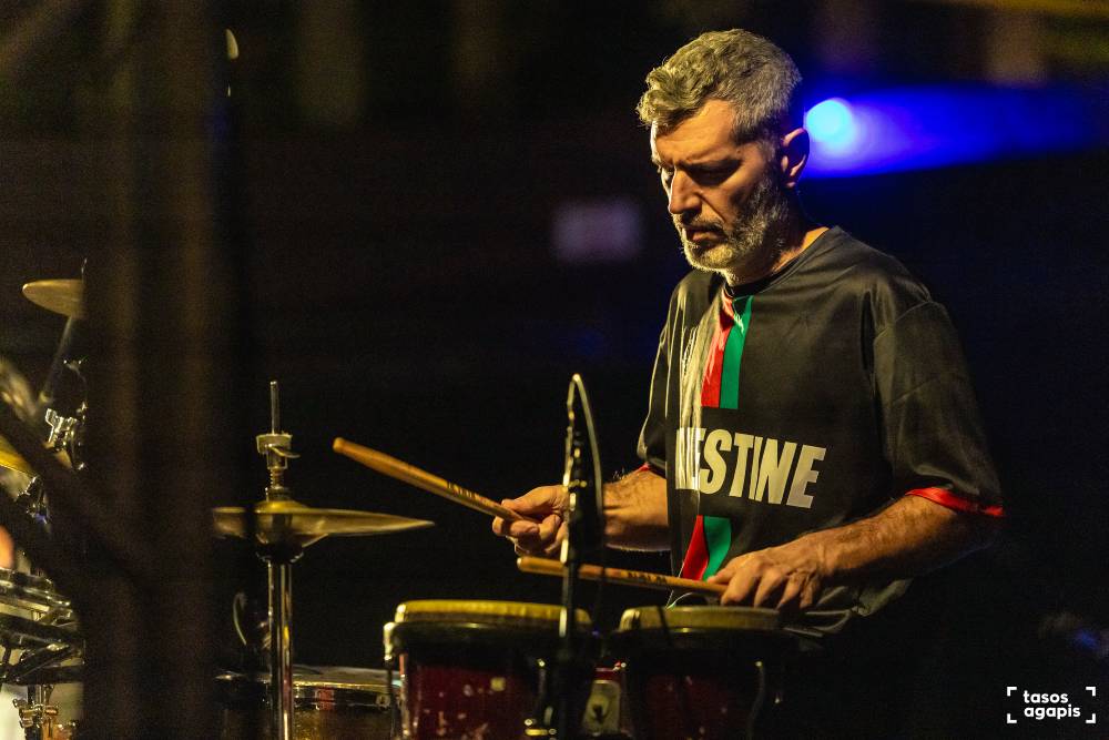 Λίγο πριν οι ΘΡΑΞ ΠΑΝΚC καταλάβουν τη σκηνή, στις 21:50, ένα αναπάντεχο και φορτισμένο στιγμιότυπο κέρδισε το επίκεντρο. Τρία μέλη της ελληνικής αποστολής του March to Gaza ανέβηκαν στη σκηνή, κρατώντας δύο παλαιστινιακές σημαίες. Το κοινό σώπασε, καθώς οι φωνές τους ήχησαν καθαρές μέσα στη νύχτα, μεταφέροντας ένα μήνυμα που δεν άφηνε περιθώρια για ουδετερότητα. Με καθαρό, δυναμικό λόγο και συγκίνηση, ανέφεραν: