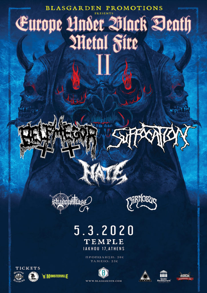 Η Blasgarden Promotions παρουσιάζει την εμφάνιση των θρυλικών συγκροτημάτων και συμμάχων της Nuclear Blast, Suffocation και Belphegor, οι οποίοι συναντιόνται και πάλι για τη δεύτερη έκδοση της Ευρώπαικής Under the Black Death Metal Fire περιοδίας. Το πακέτο ενισχύεται από τους γνωστούς Πολωνούς Hate.