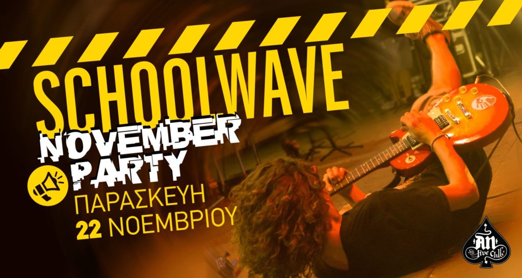 Την Παρασκευή, 22 Νοεμβρίου, το Schoolwave έρχεται για πρώτη φορά στο AN club ‘official’! 🔥♠Τα σκαλιά του ιστορικού club των Εξαρχείων θα κατέβουν 7 μαθητικά και φοιτητικά συγκροτήματα – ανάμεσά τους οι «βετεράνοι» Loud Silence που μόλις ηχογράφησαν το πρώτο τους επαγγελματικό album και οι Ciggy Kiss, λίγο πριν κυκλοφορήσουν το πρώτο τους single με την Minos Emi.