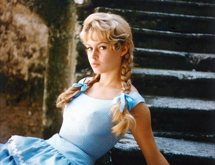 Brigitte Bardot, French actress, model and singer, wearing a blue gingham dress with her hair in plaits, tied with blue bows, sitting in a series of stone steps, 1960. (Photo by Silver Screen Collection/Getty Images)