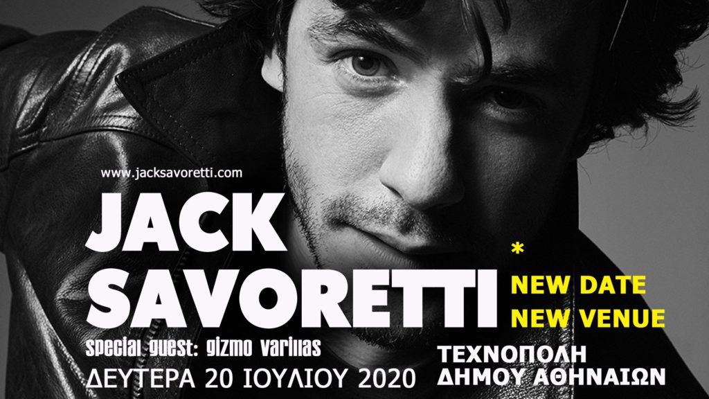 Η διοργανώτρια εταιρία DOLEDRUMS MUSIC EVENTS, ύστερα από συνεννόηση με τον καλλιτέχνη, σας ενημερώνει, πως η νέα ημερομηνία για την συναυλία του JACK SAVORETTI στην Αθήνα είναι η Δευτέρα 20 Ιουλίου 2020!
