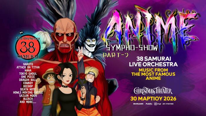 Η ορχήστρα 38 SAMURAI σας προσκαλεί σε μια ανεπανάληπτη συμφωνική εμπειρία με τίτλο «Anime Sympho-Show», στο πλαίσιο της ευρωπαϊκής περιοδείας 2025–2026, την Δευτέρα 30 Μαρτίου στο Christmas Theater.