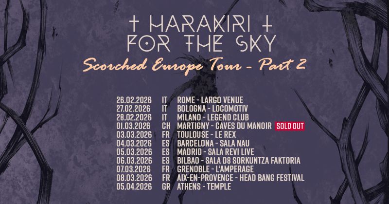 Εφόσον γυρίσαν σχεδόν όλο τον κόσμο οι Harakiri for the Sky, αποφάσισαν να επιστρέψουν Ευρώπη για άλλη μια βόλτα σε διάφορες πρωτεύουσες και μη. Μέσα σε αυτές είναι και η Αθήνα, όπου και θα εμφανιστούν στο Temple στις 4 και 5 Απριλίου.