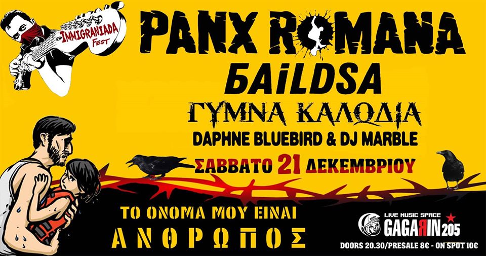 Το Immigraniada Festival διοργανώνει, εν μέσω εορτών, μια συναυλία – αντιγιορτή για καλό σκοπό και παρουσιάζει το Σαββάτο 21 Δεκέμβρη στο Gagarin τους PANX ROMANA, με διαχρονικό πανκ ροκ που διαταράσσει την κανονικότητα, τους BAILDSA με τη διεθνή παρουσία με Βalkan Punk Ska Reggae, τα ΓΥΜΝΑ ΚΑΛΩΔΙΑ που τραγουδάνε ακόμα και με βροχή από δακρυγόνα και χημικά στην πλατεία Εξαρχείων, την DAPHNE BLUEBIRD με ένα μουσικό blend κουλτούρας και άποψης από Hip Hop, Reggae, Dub και τον DJ MARBLE ιδρυτικό μέλος των Βαβυλώνα γνωστό και ως Κύρος και μουσικό πολυεργαλείο σε δεκάδες παραγωγές.