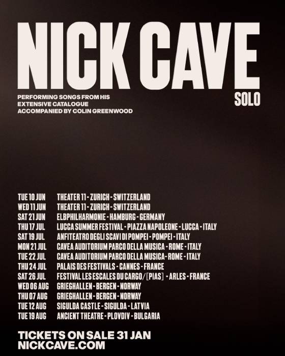 Συγκεκριμένα, προς τους θερινούς μήνες, η περιοδεία που όλο και ενημερώνεται, παίρνει ζωή σε solo μορφή, από τον Nick Cave. Δε είναι διόλου απίθανο να τον δούμε και πάλι στη χώρα μας, αν και μεγάλη κουβέντα δε λέω (καλού κακού ας παίξω ένα τζόκερ).