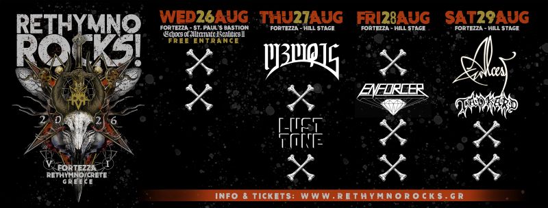 Οι Σουηδοί Speed Metallers Enforcer επισκέπτονται για δεύτερη φορά το Ρέθυμνο. Πριν χρόνια είχαν έρθει ξανά κάνοντας μια τρομερή εμφάνιση στη Περιηγητική Λέσχη με τους Thrash Metallers Menace. Έχοντας στο ενεργητικό τους εντυπωσιακά άλμπουμ όπως είναι το τελευταίο τους, “Nostalgia” αλλά και πιο παλιά όπως τα “Into the night”, “Diamonds”, “Death by fire” και “From Beyond” θα εντυπωσιάσουν σίγουρα τους οπαδούς του ταχύτατου Heavy Metal.