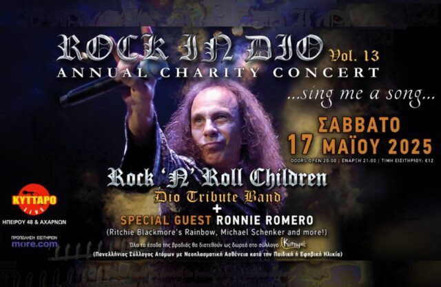 Το Σάββατο 17 Μαϊου 2025 το ROCK IN DIO Vol.13 παίρνει θέση για ακόμα ένα Annual Charity Concert με τους Rock ΄n΄ Roll Children The Greek DIO tribute band LIVE με SPECIAL GUEST τον RONNIE ROMERO (Richie Blackmore’s RAINBOW, Michael Schenker and more).