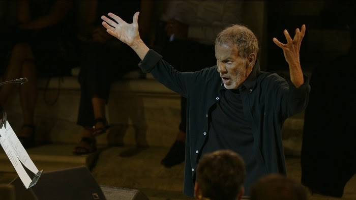 Ο ίδιος διευθύνει, δίνει παλμό σε τραγουδιστές και μουσικούς, αφηγείται ιστορίες της δημιουργίας του έργου, τραγουδάει το «Πρακτορείο».