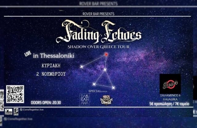 Μετά από μια σειρά καθηλωτικών εμφανίσεων σε Αθήνα, Βόλο και Λάρισα, οι Fading Echoes ανεβαίνουν για πρώτη φορά στη συμπρωτεύουσα για να παρουσιάσουν το πολυσυζητημένο concept album “Shadow of Another” στο σύνολό του, καθώς και νέες συνθέσεις από το επερχόμενο τους υλικό.